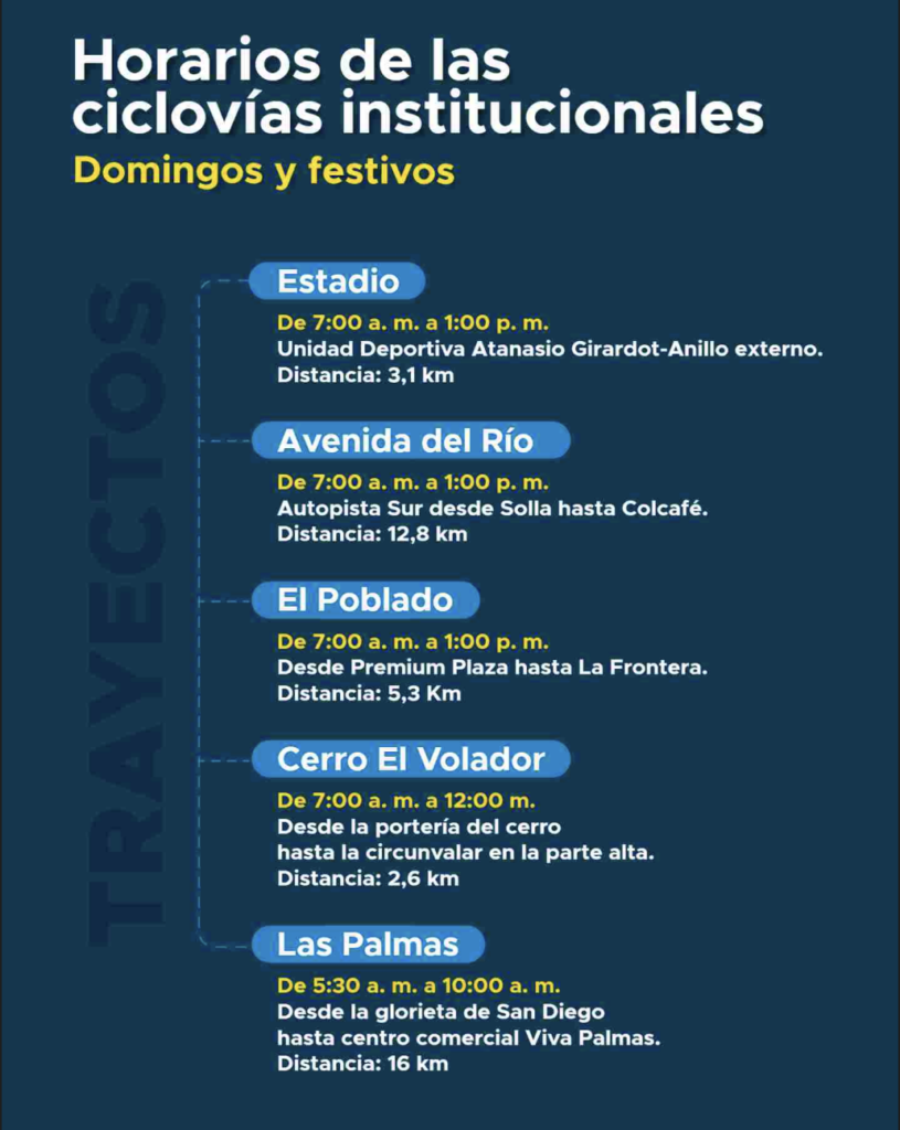 Las ciclovías de Medellín son una iniciativa que consiste en cerrar temporalmente ciertos tramos viales de la ciudad a la circulación vehicular, convirtiéndolos en espacios seguros y exclusivos para que los ciudadanos puedan realizar actividades recreativas y deportivas.